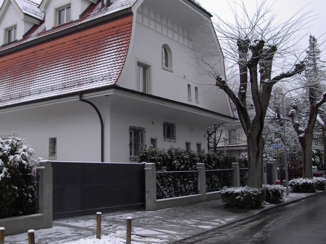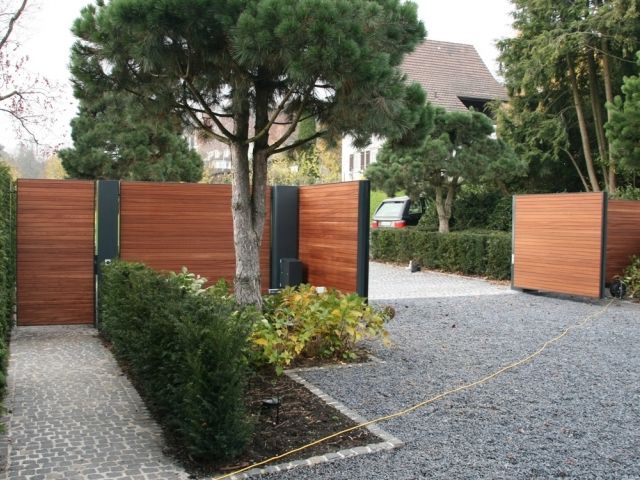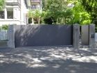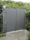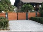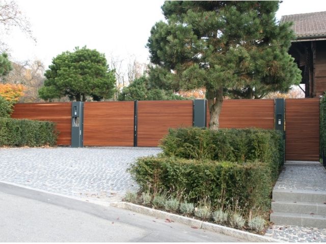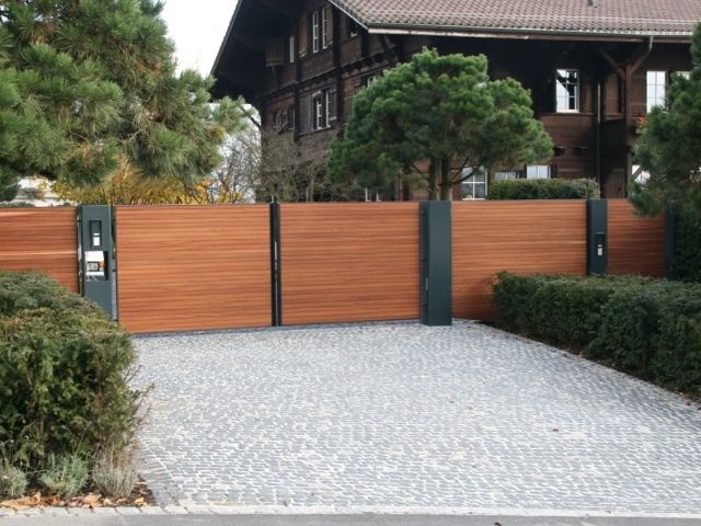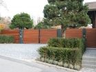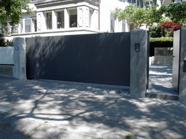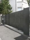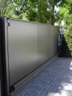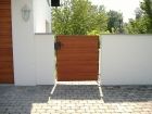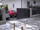 Automatisiertes Einfahrtstor mit Fernsteuerung zu öffnen mit separatem Personeneinganstor und integrierter Gegensprechanlage sowie Briefkasten.