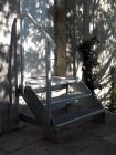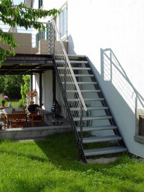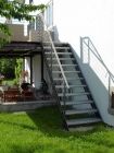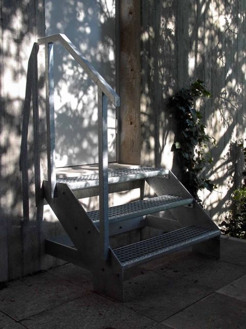 Gitterrost-Treppe mit Podest und Geräteschuppen