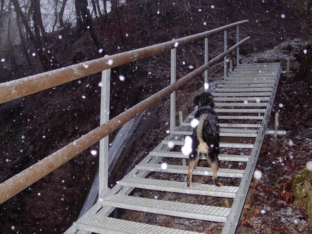 Gitterrosttreppe für Wanderweg neben Wasserfall